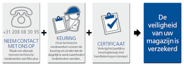 Al meer dan 30 jaar biedt Mecalux zijn klanten een « Keuring Magazijnstellingen » aan om de veiligheid en de efficiëntie van het magazijn te optimaliseren. Als fabrikant zijnde is Mecalux uitstekend gekwalificeerd magazijnen te controleren en keuringscertificaten uit te geven.