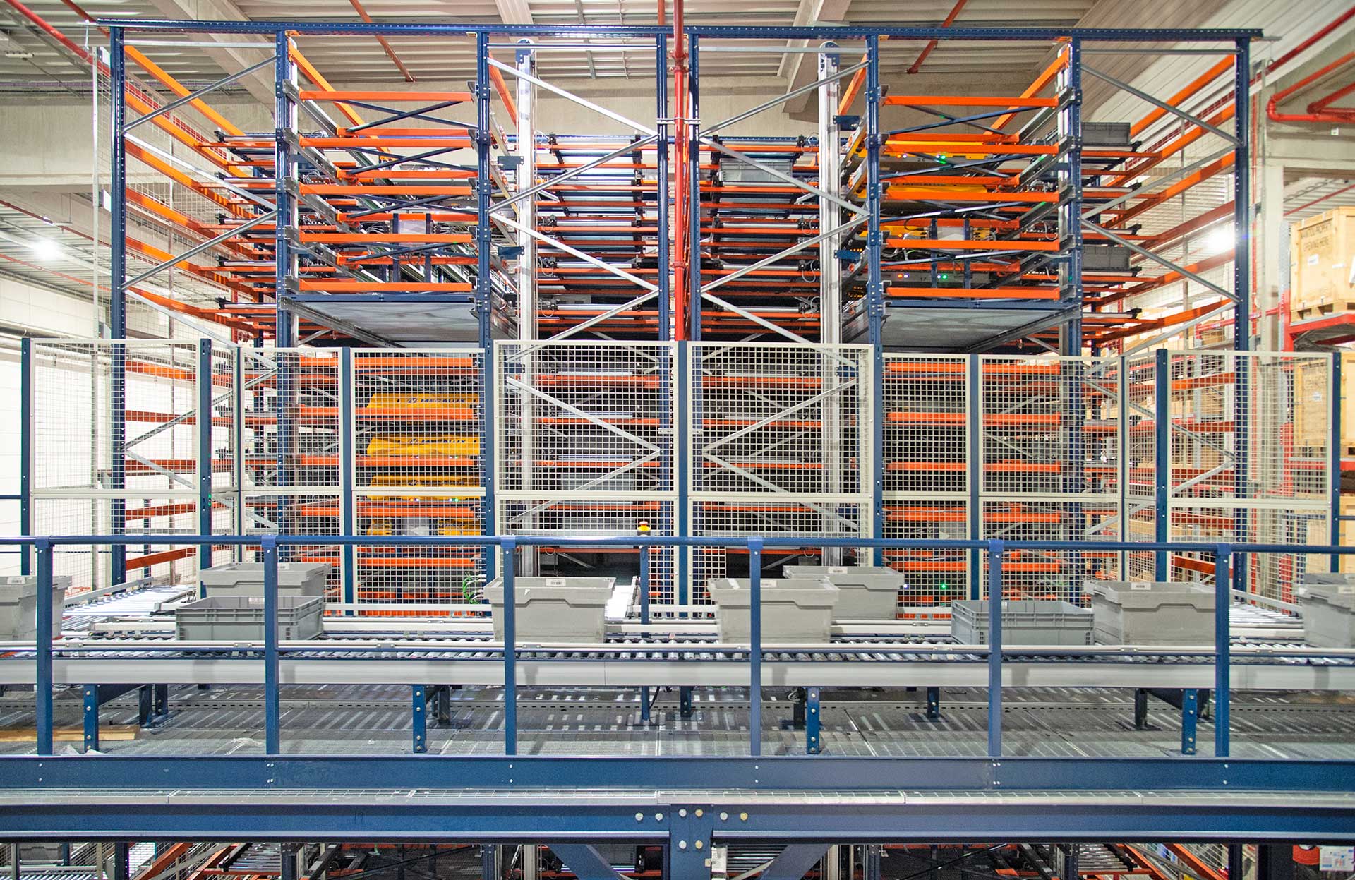 - Volledig automatisch opslagsysteem voor dozen, magazijnbakken en kleingoed.