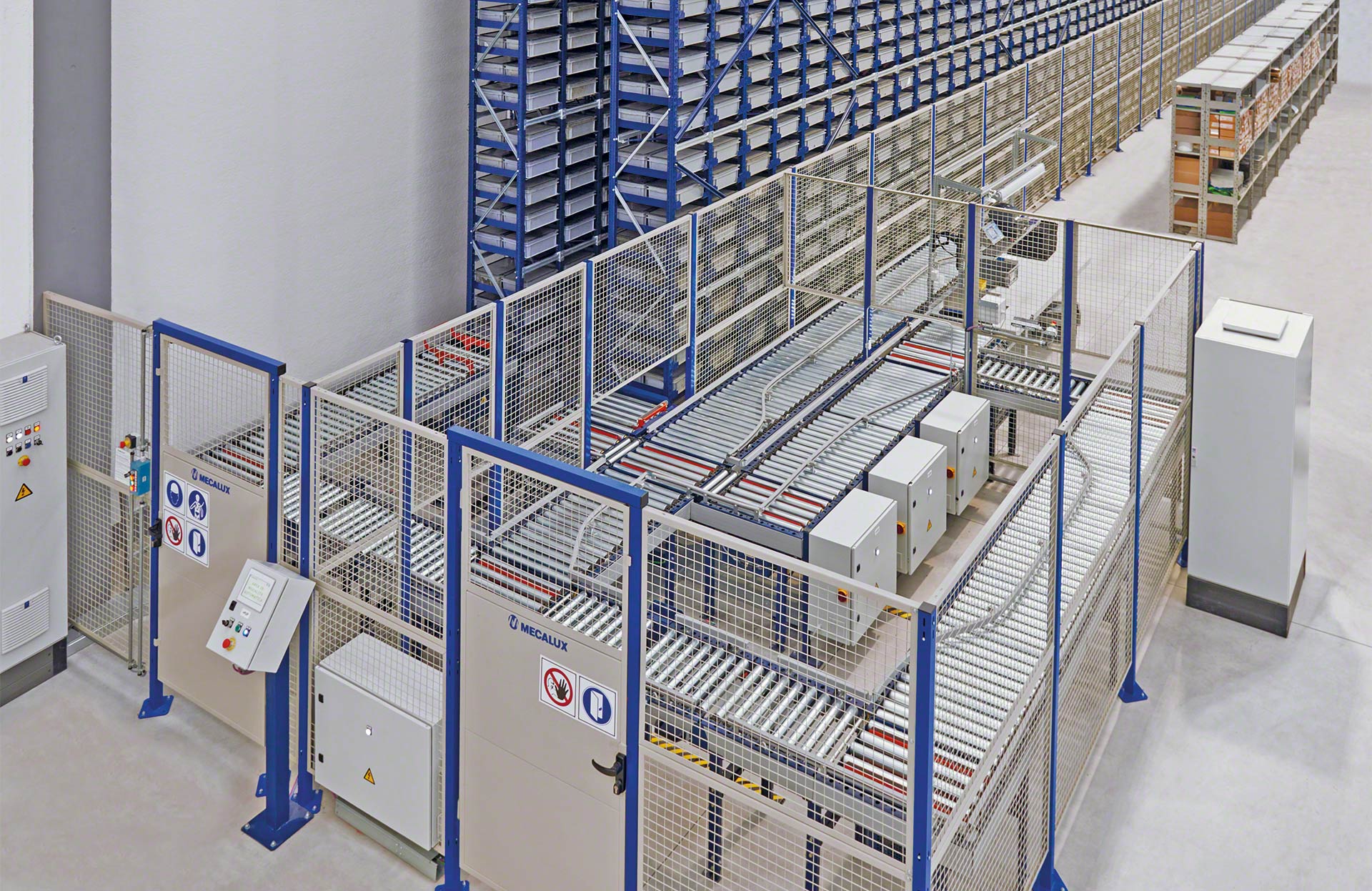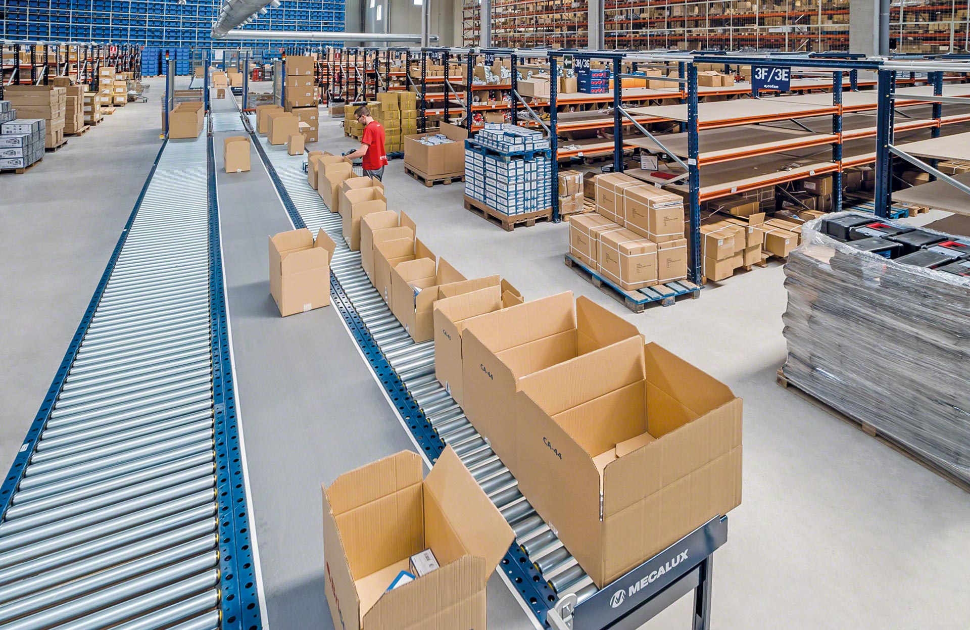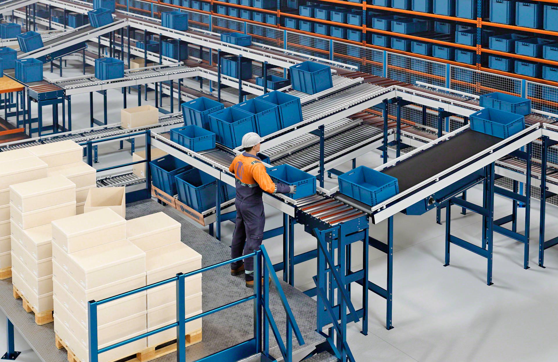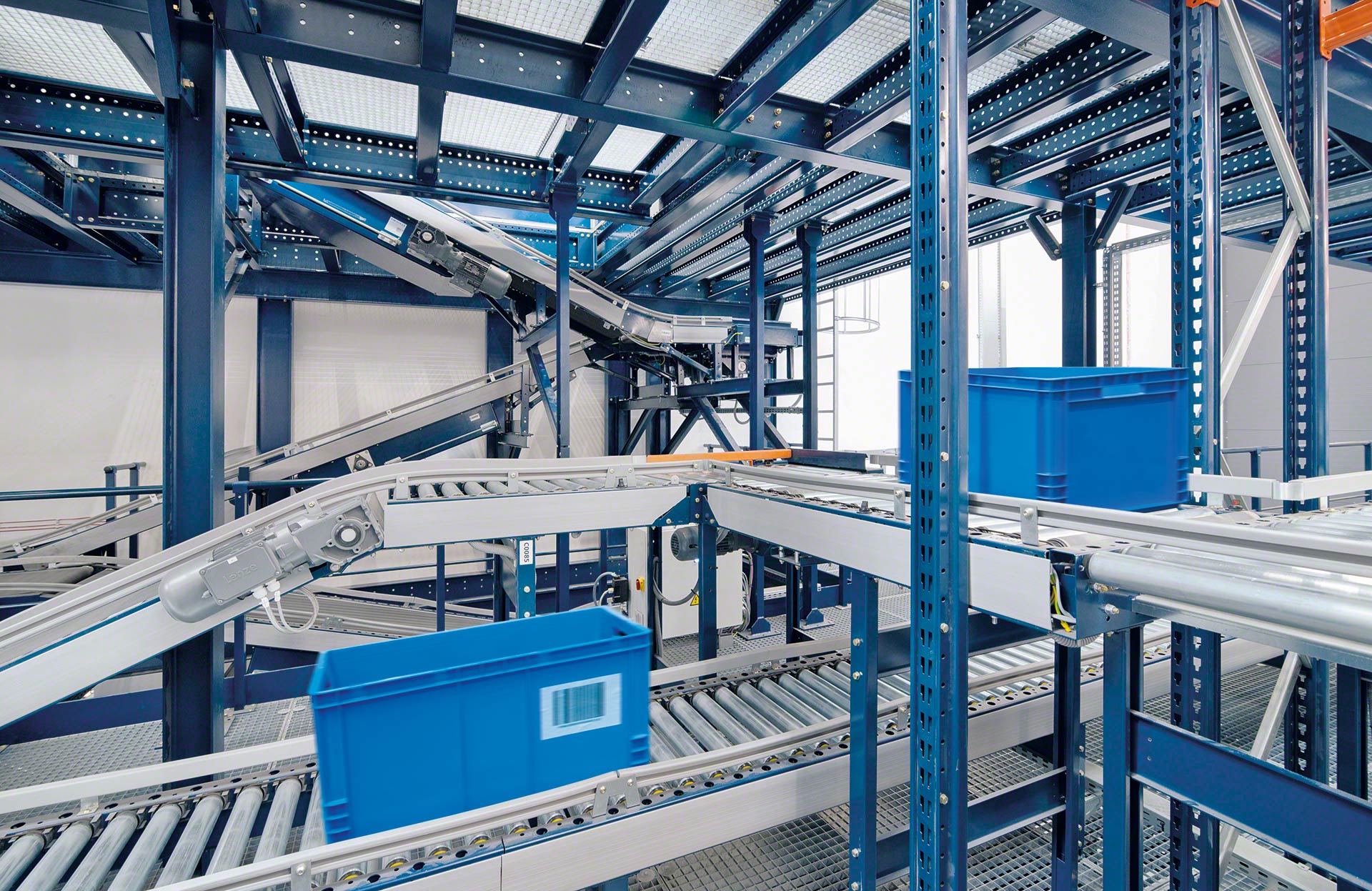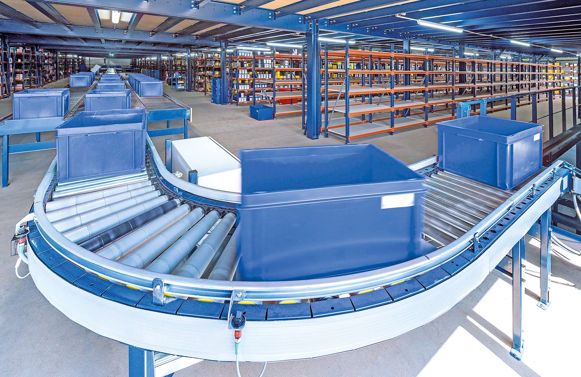 Mecalux biedt verschillende soorten transportbanen voor dozen of kratten (met rollen, met banden en combinatie van rollen en banden). Rollenbanen zijn systemen waarbij de laadeenheid wordt verplaatst door een reeks metalen cilinders die om een as draaien en aangedreven worden door een motor of door de werking van de zwaartekracht. Bij een transportbaan voor dozen of kratten ligt de lading op een band die bestaat uit aaneengesloten rubberen of plastic platen die ronddraaien tussen twee aangedreven trommels aan elk uiteinde van de band. Gemengde transportbanen zijn systemen die de rollen combineren met banden die in een hoek zijn geplaats om de transportrichting of oriëntatie van de getransporteerde laadeenheid te veranderen.