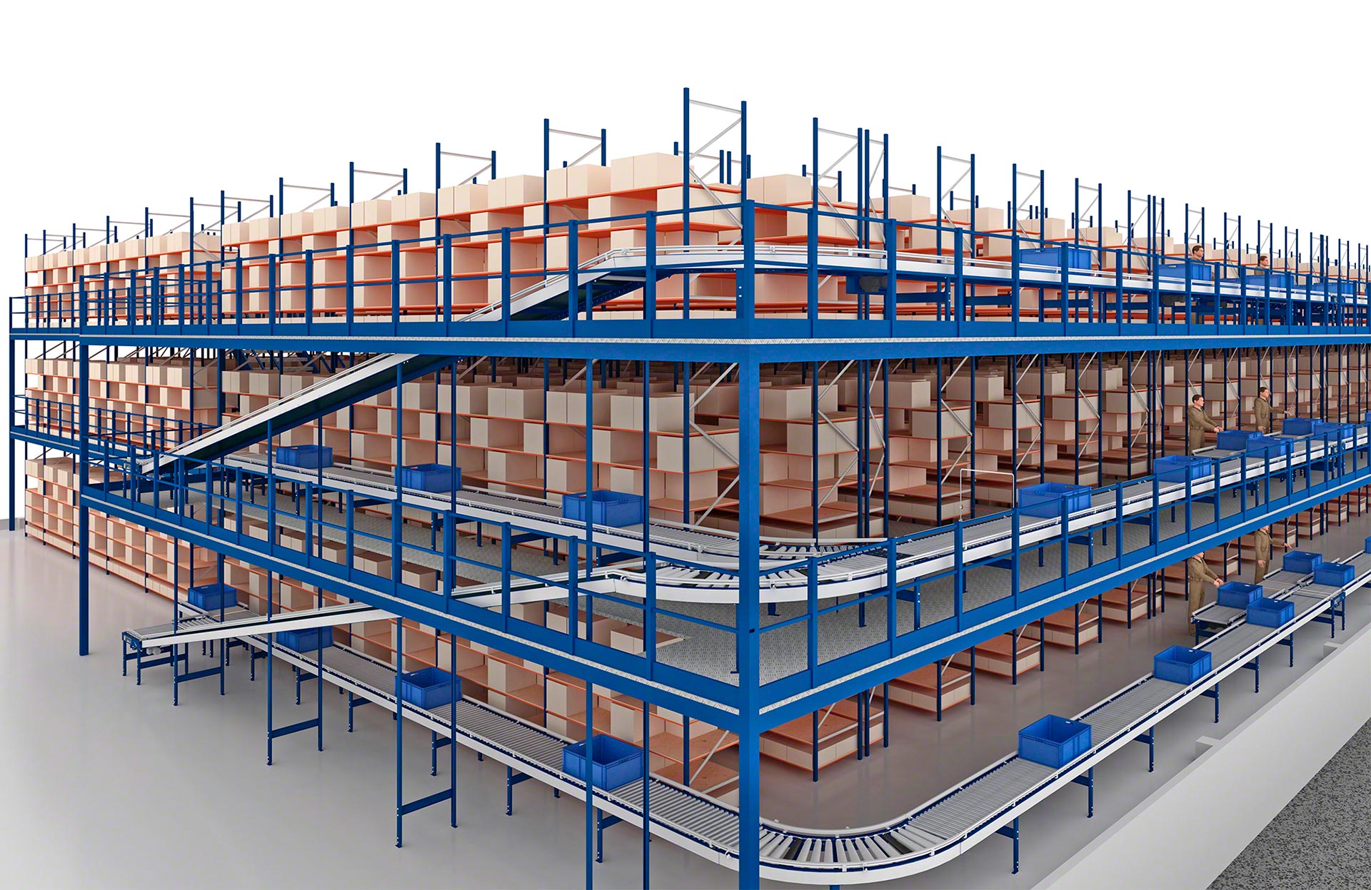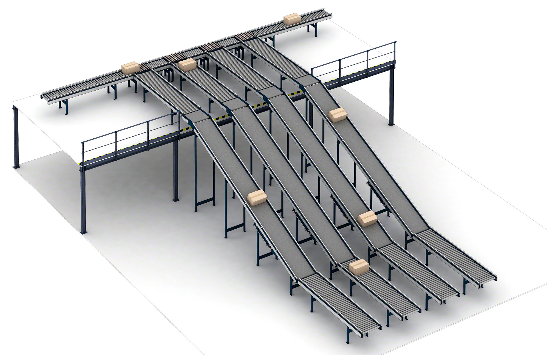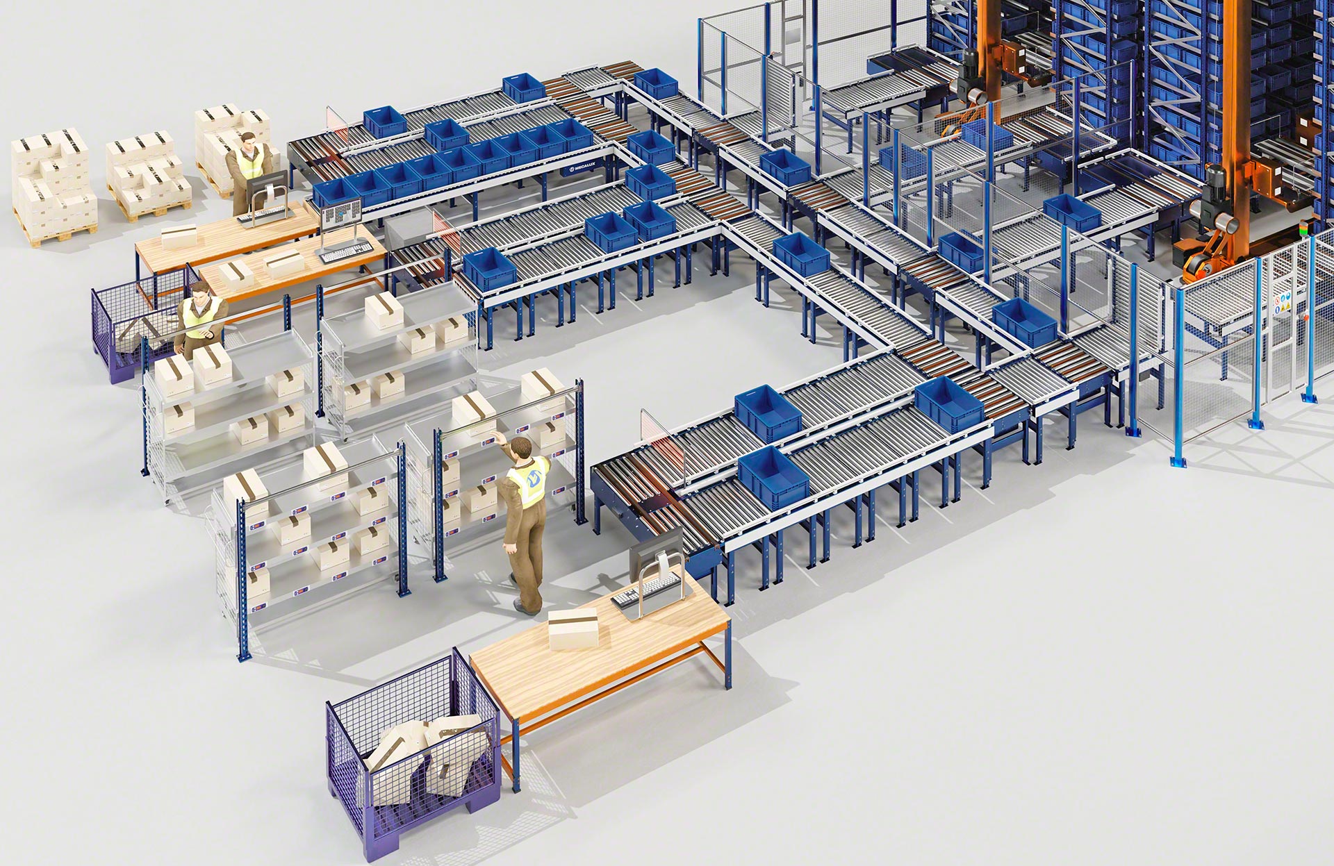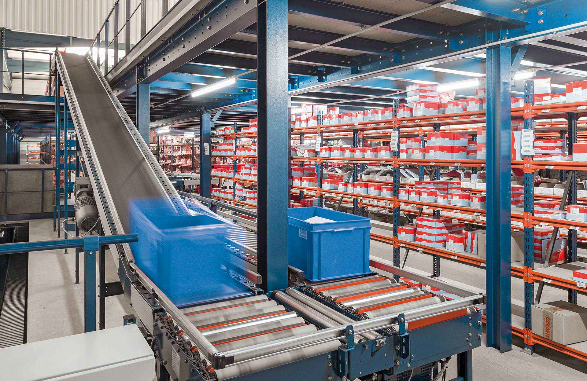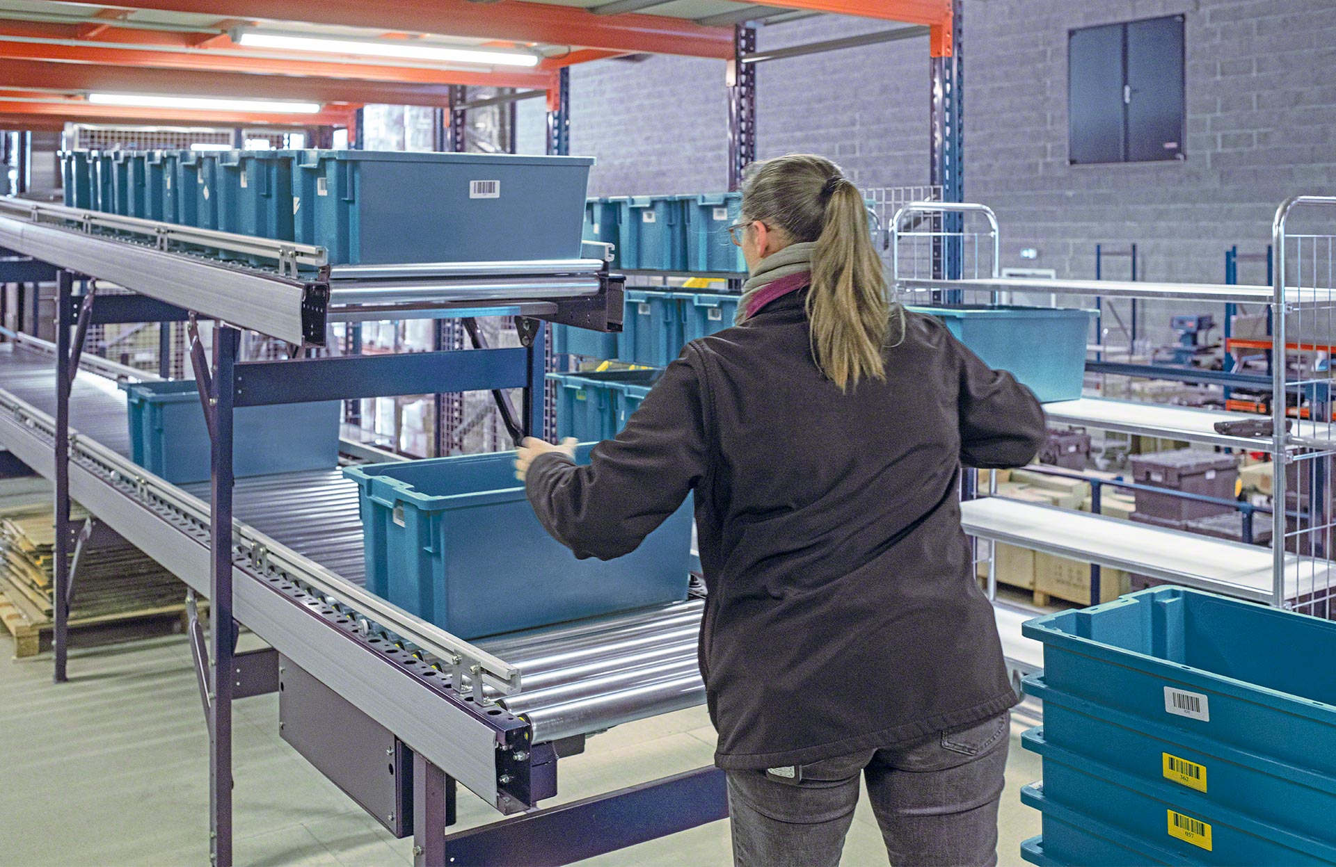 Mecalux biedt verschillende soorten transportbanen voor dozen of kratten (met rollen, met banden en combinatie van rollen en banden). Rollenbanen zijn systemen waarbij de laadeenheid wordt verplaatst door een reeks metalen cilinders die om een as draaien en aangedreven worden door een motor of door de werking van de zwaartekracht. Bij een transportbaan voor dozen of kratten ligt de lading op een band die bestaat uit aaneengesloten rubberen of plastic platen die ronddraaien tussen twee aangedreven trommels aan elk uiteinde van de band. Gemengde transportbanen zijn systemen die de rollen combineren met banden die in een hoek zijn geplaats om de transportrichting of oriëntatie van de getransporteerde laadeenheid te veranderen.