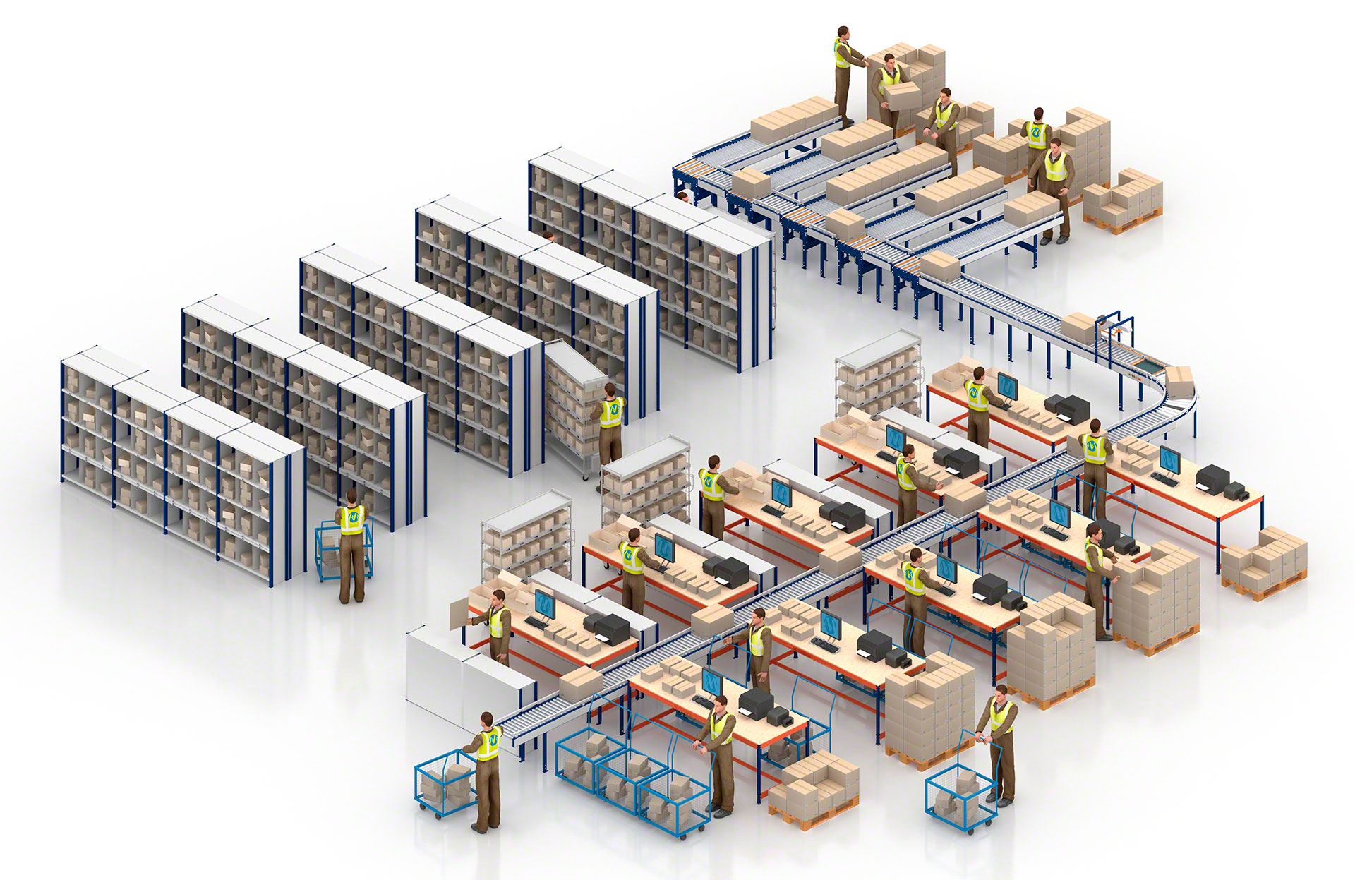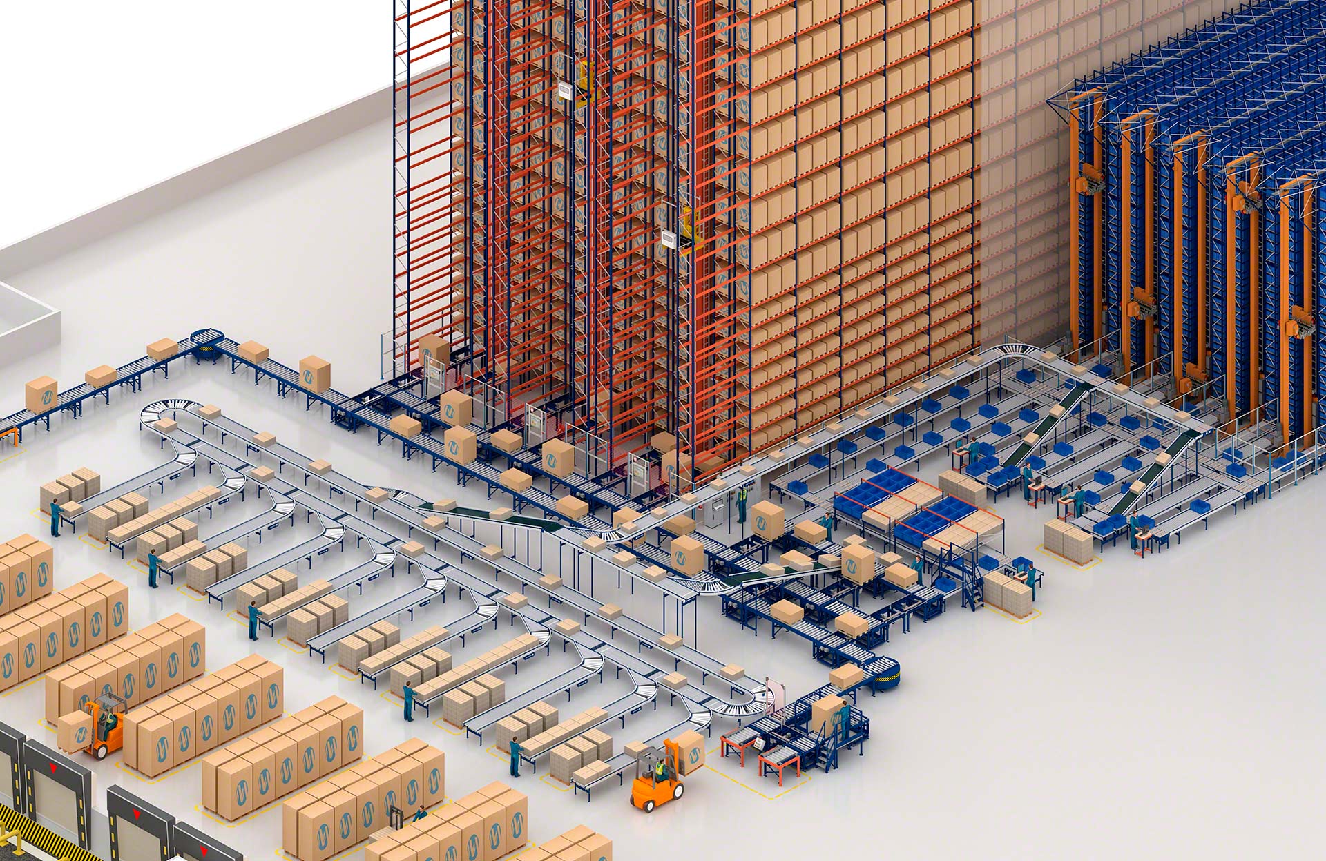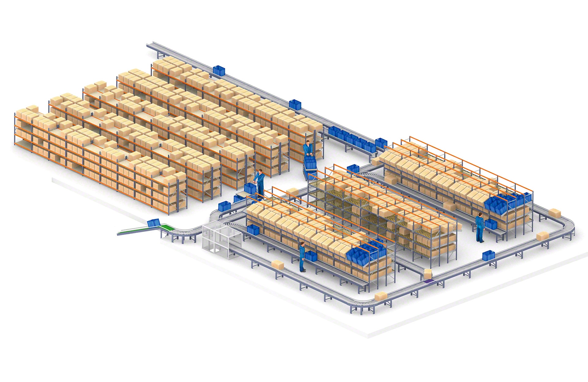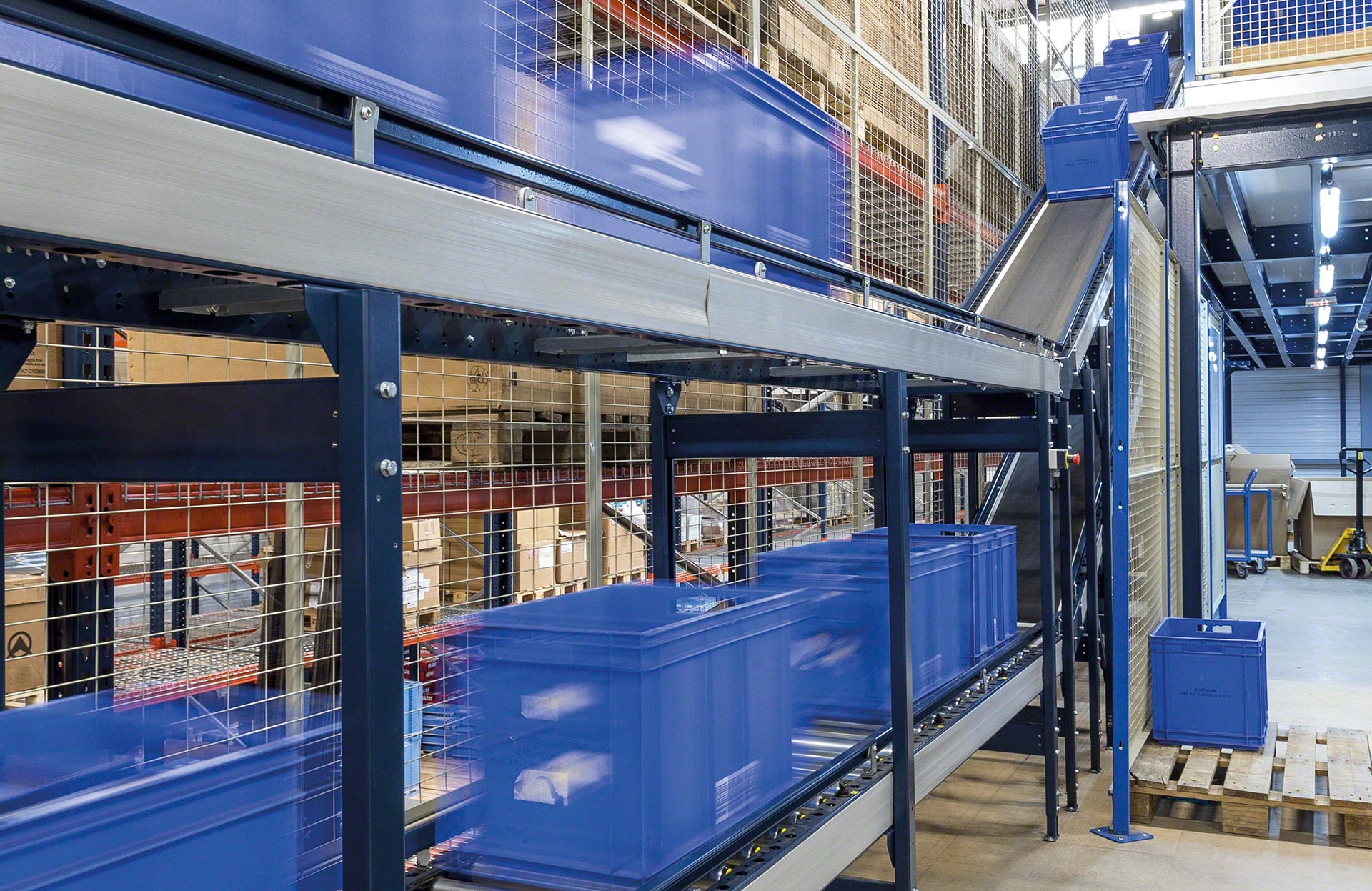 Een transportbaan voor dozen of kratten beperkt de goederenbehandeling en het verkeer van operatoren en afhandelingsapparatuur tot een minimum, waardoor de productiviteit toeneemt en tegelijkertijd de fouten en bedrijfskosten worden verminderd.