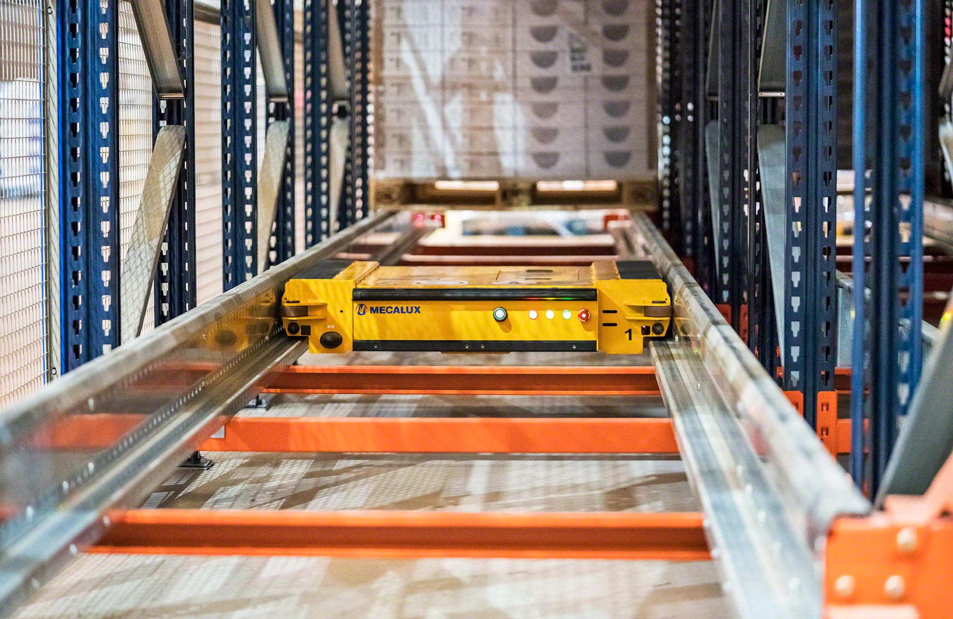 Mecalux biedt echter ook een volautomatisch alternatief, de automatische Pallet Shuttle. Hierbij wordt de vorkheftruck vervangen door een magazijnkraan of een stel automatische shuttles die de wagen en het pallet volledig autonoom van de invoerposities naar elk opslagkanaal brengen. Alle bewegingen in dit systeem worden rechtstreeks door de software aangestuurd.