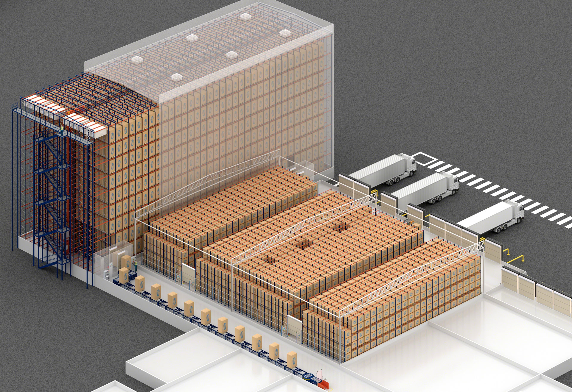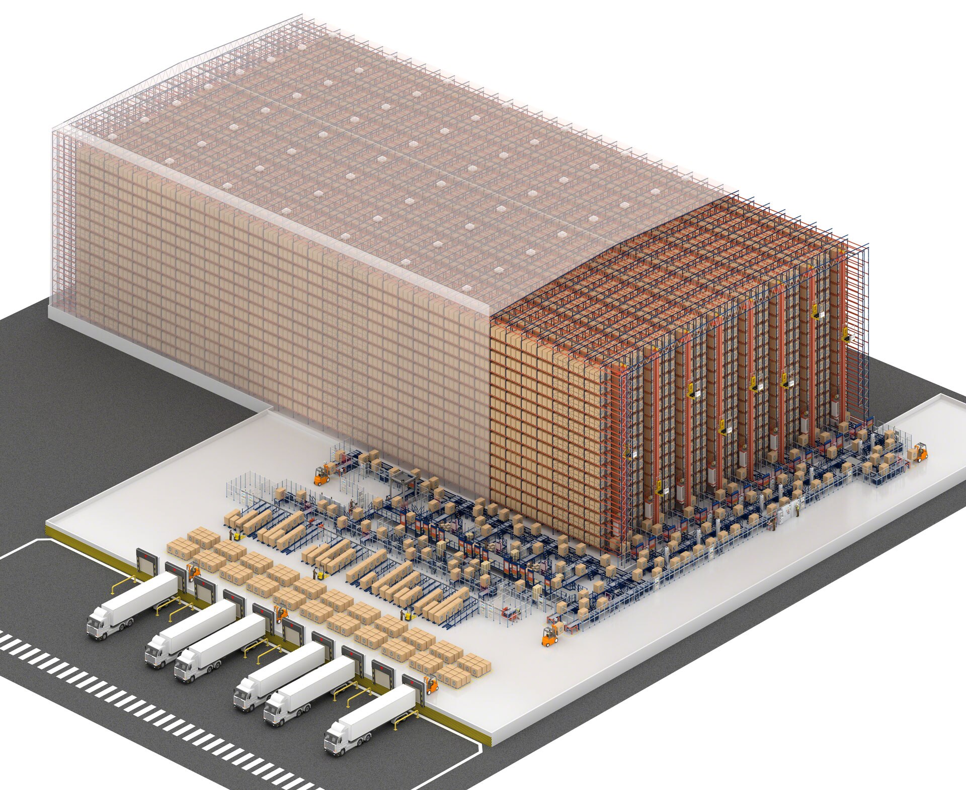 Het hoogbouwmagazijn kan worden uitgerust met een groot aantal palletopslagoplossingen. Van conventionele stellingen of stellingen met hoge dichtheid tot volledig geautomatiseerde systemen.